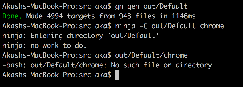 [22:34:13] <akashag> I am able to run the command "ninja -C out/Default chrome" successfully, but there is no binary present as "out/Default/chrome". Can anyone please mention if I am missing anything