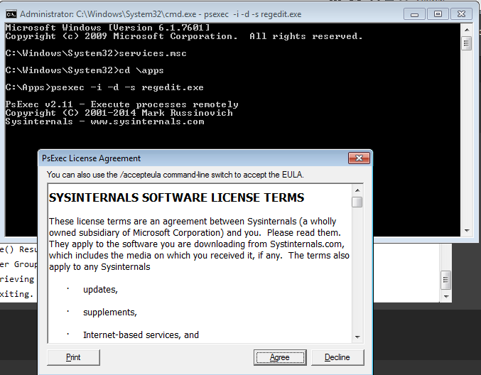 [18:43:15] <BobFrankly> anyone seen: psexec -i -d -s regedit.exe not work?